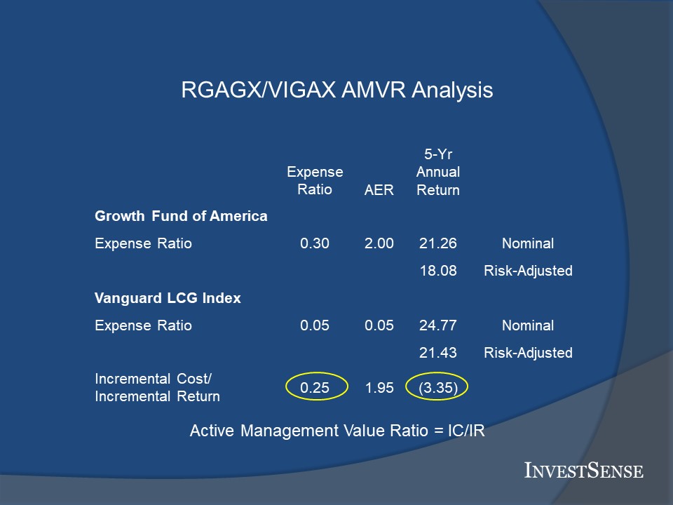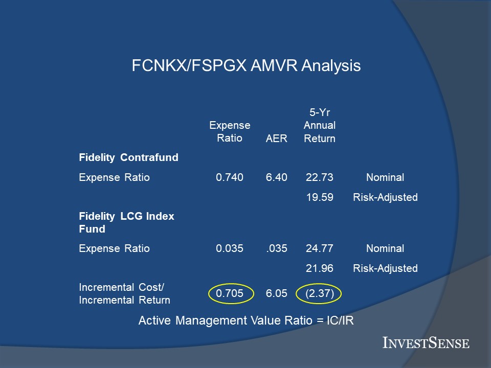 The cornerstone of my fiduciary compliance consulting practice is InvestSense’s proprietary metric, the Active Management Value Ratio (AMVR). The AMVR evaluates the cost-efficiency of actively managed mutual funds relative to comparable index funds. While many actively managed funds compare their performance to a comparable market index, market indices do not allow for cost-efficiency analyses since indices do not have costs. That is why the AMVR uses comparable index funds, as such funds do have costs similar to actively managed mutual funds.