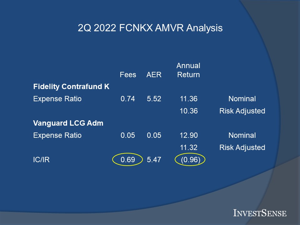 In an earlier AMVR analysis, Fidelity Contrafund K shares were compared to Vanguard Large Cap Growth Index shares. An AMVR forensic analysis comparing Contrafund to Fidelity’s Large Cap Growth Index shares is shown below.