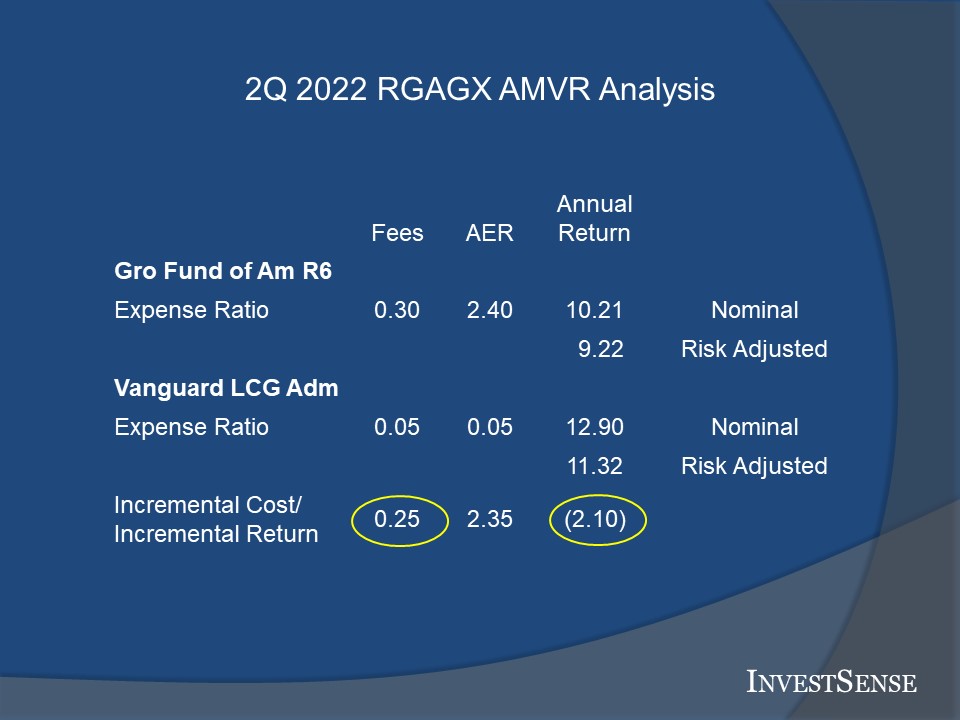 The AMVR slides speak for themselves. Situations where an investment’s incremental costs exceed its incremental returns is never a desirable, or prudent, investment scenario. Cost-inefficient investment alternatives within a 401(k) plan are not legally valid “choices.” Additional details on the calculation and interpretation are available on this website.