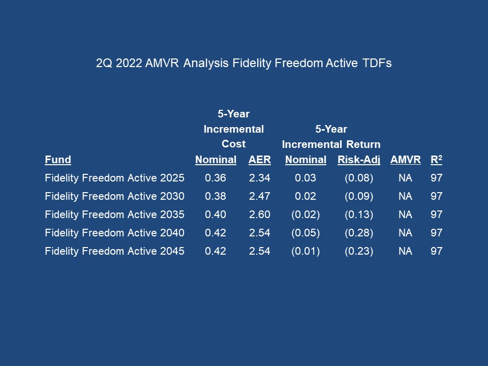 The CommonSpirit case provided users of the AMVR with a unique opportunity – the opportunity to compare the cost-efficiency and respective prudence of two competing products offered by the same fund company, in this case Fidelity Investments. The products in this case involved the Fidelity Freedom suite of actively managed target date funds (TDFs) and the Fidelity Freedom Index TDFs.