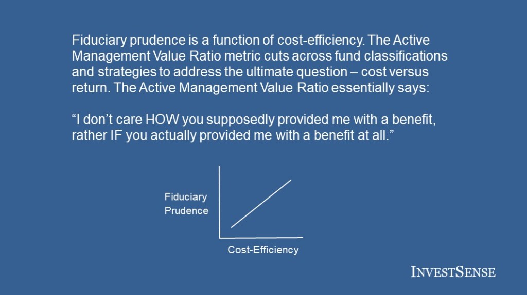 The Active Management Value Ratio™ provides plan sponsors and other investment fiduciaries with a fundamentally sound and simple means of accomplishing these goals using index funds. In so doing, plan sponsors can create and maintain a win-win plan, one that provides genuine benefits for plan participants and protects plan sponsors against unnecessary and unwanted exposure to fiduciary liability.