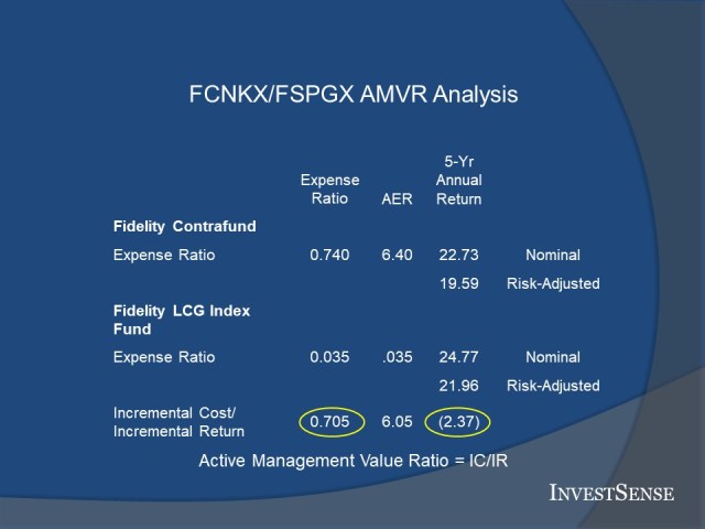 So, how would FCNKX match up with the Admiral shares of Vanguard’s version of a Large Cap Growth Index Fund (VIGAX)? As the chart shows, FCNKX would still be an imprudent choice for a fiduciary, underperforming VIGAX by 96 basis points and forcing an investor to incur an incremental loss of 69 basis points, for a combined loss of 165 annually and Better, but still imprudent and a breach of the plan sponsor’s fiduciary duties.