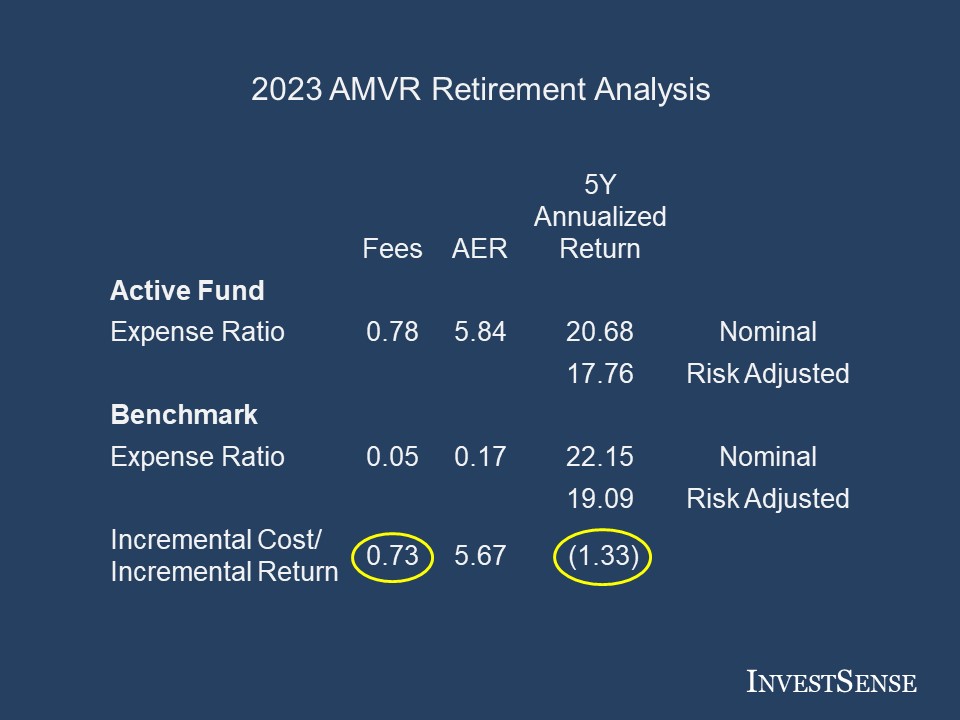 An AMVR analysis can be calculated for any time period. In this case, a five-year analysis comparing an actively managed fund and a comparable index fund shows that the actively managed fund is cost-inefficient, as it fails to provide a positive incremental return (1.33), so naturally the incremental costs exceed the incremental returns. A cost-inefficient fund is an imprudent investment under the Restatement (Third) of Trusts.