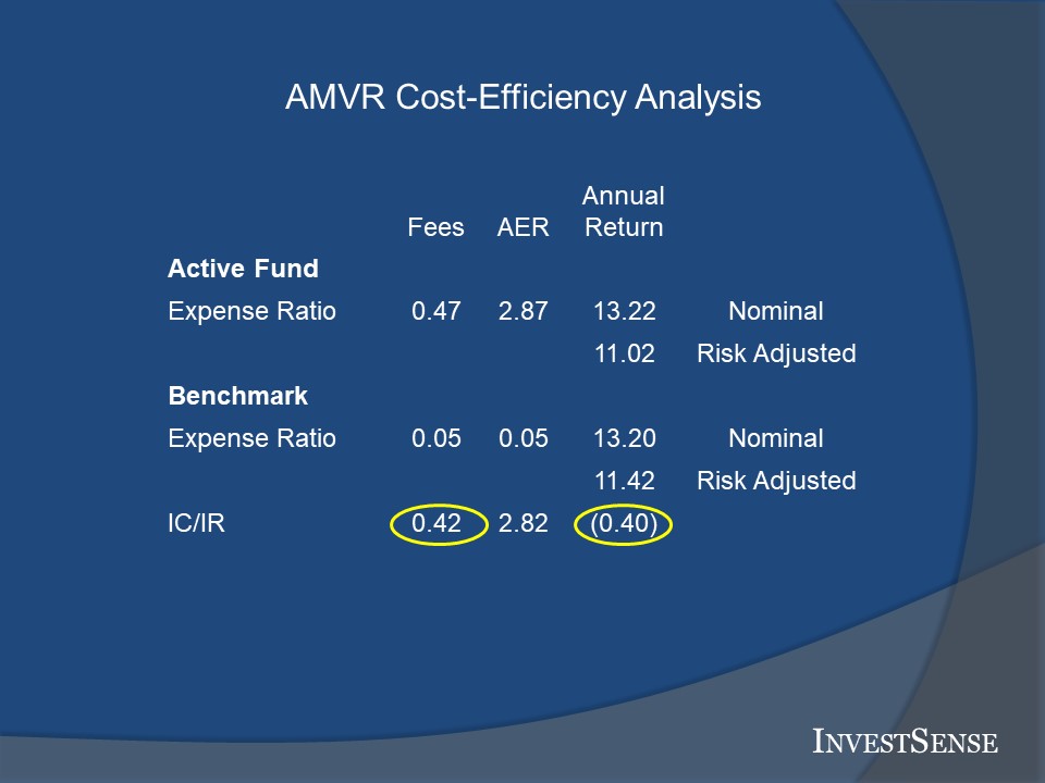 A simple metric that I created, The Actively Management Value Ratio (AMVR), allows investors, plan sponsors, trustees and other investment fiduciaries to do just that. The AMVR allows anyone to quickly compare the relative cost-efficienccy of two mutual funds.