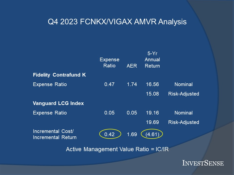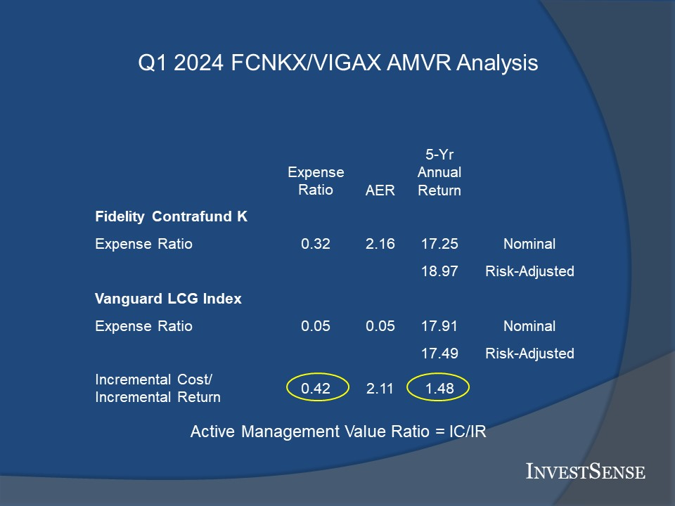 The AMVR slide below shows the results of an AMVR analysis between FCNKX and a comparable index fund, the Vanguard Large Cap Growth Index Fund Admiral shares (VIGAX), for the 5-year period ending on December 31, 2023. Shown below the Q4 2023 analysis is a 5-year AMVR analysis of the same funds, for the same five-year period ending on March 31, 2024.