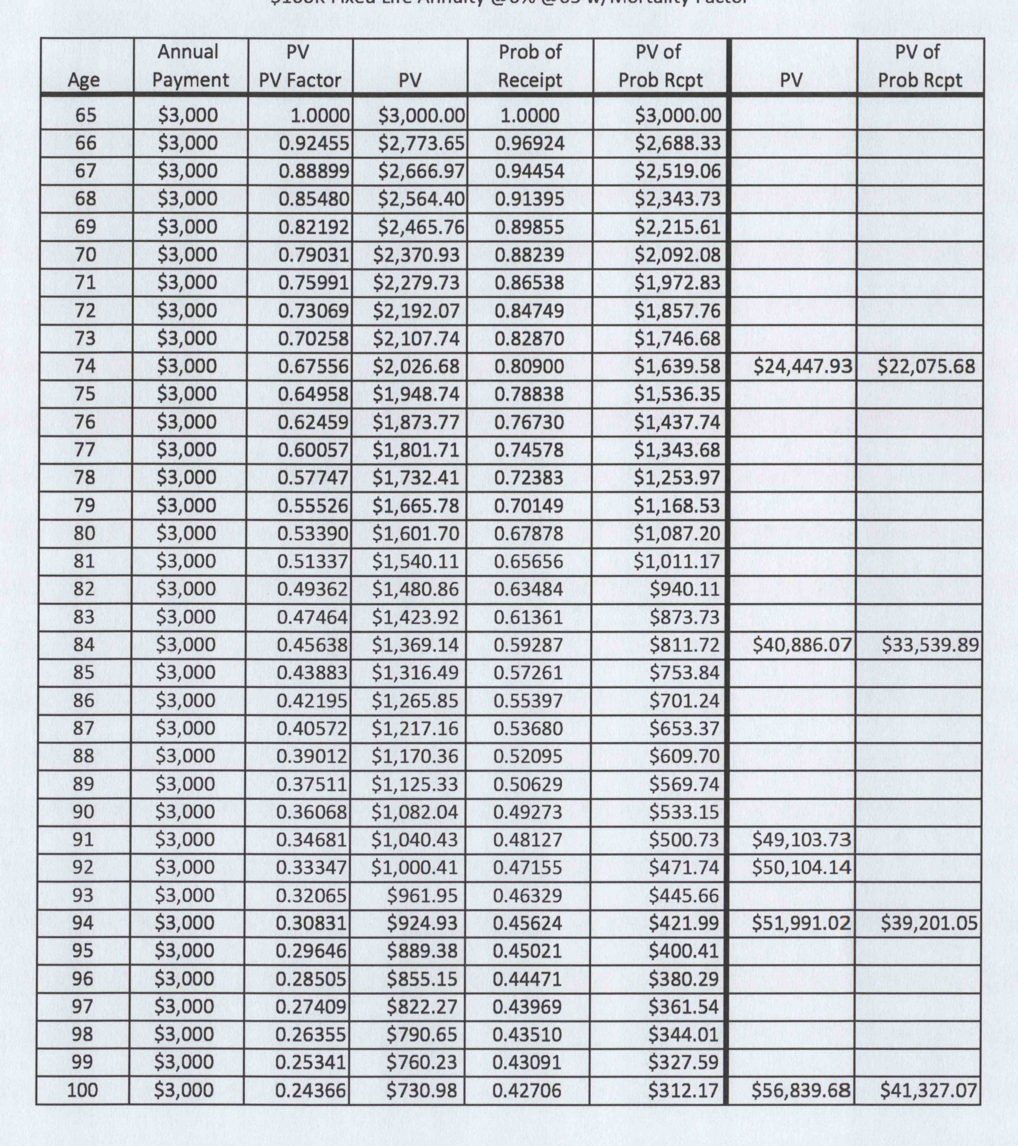 A properly prepared forensic breakeven analysis of an annuity should always factor in both present value and mortality risk. Present value is important not only in terms of factoring in the impact of inflation and the impact of the time value of money, but also because many annuity owners eventually sell their annuity because it is not providing them with the level of additional income needed. The party purchasing an annuity will typically base their offer on the present value of the annuity, not the original purchase price, as well as the present value of the annuity factoring in the mortality risk factor. in the example shown, note the significant difference in the present value calculations and the resulting commensurate return and fiduciary prudence issues.