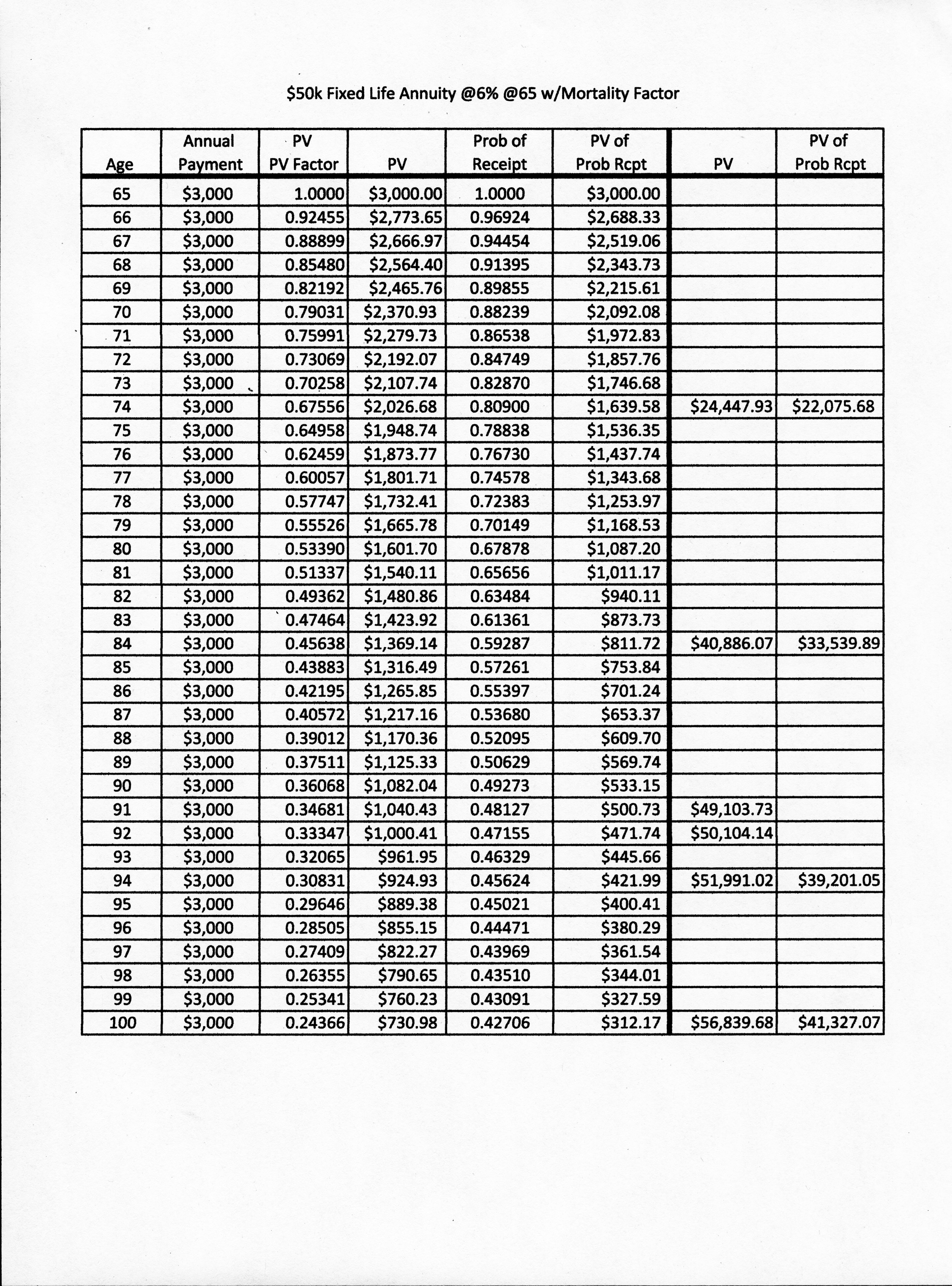 Based purely on present value, the analysis projects that the annuity owner would breakeven, i.e., recover their initial investment sometime between age 91 and 92 years of age. At age 65, the annuity owner has an expected life expectancy of 21 years, or age 86. The odds of a 65 year old living to age 91 or 92 is only 30 percent. Keep in mind these numbers do not even include the fact that factoring in mortality risk, even if the annuity owner reaches age 100, the annuity owner will have recovered less than half of their original investment ($41, 320.07).