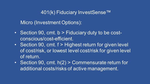 A basic understanding of the core principles set out in the Restatement (Third) of Trusts is an absolute necessity for prudent plan sponsors and other investment fiduciaries. In my opinion, three key comments in Section 90 of the Restatement, aka The Prudent Investor Rule, are shown in the box below.