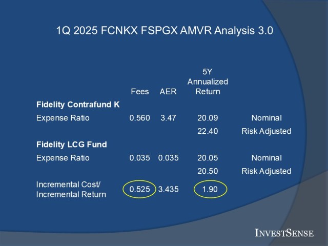 In the AMVR analysis shown for FCNKX and VIGAX (Vanguard Large Cap Growth Index Fund), based purely on the nominal, or publicly reported numbers, VIGAX, is the more prudent option due to an incremental risk-adjusted return (0.07) that is less than the incremental cost between the two funds (0.51). If we base the comparison on the AER correlation adjusted costs, the prudency of the VIGAX is even clearer (3.26 v 0.07).