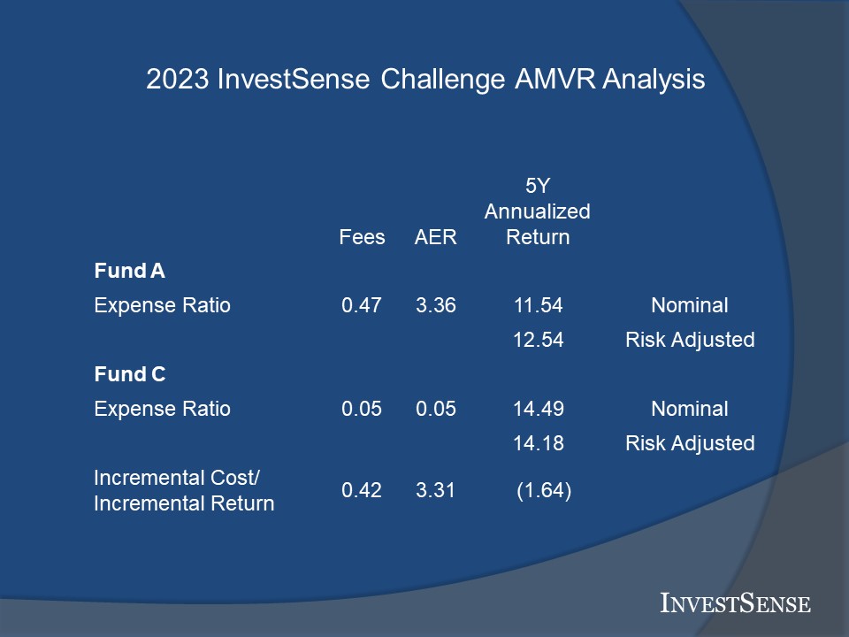 Since the AMVR is essentially a cost/benefit analysis, the goal for an actively managed fund is an AMVR number greater than “0” (indicating that the fund did provide a positive incremental adjusted return), but equal or less than “1” (indicating that the fund’s incremental adjusted costs did not exceed the fund’s incremental adjusted return).