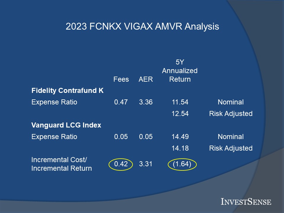 Since we are using the two “virtual” funds approach in analyzing the actively managed fund, we need to add back the index fund’s stated expense ratio (.05), resulting in an AER of 2.87. approximately 5 times higher than the fund’s stated expense ratio. Remember, wasting plan participants’ money is never prudent.