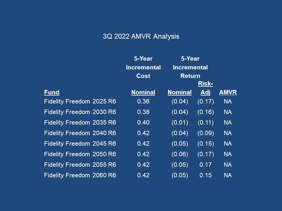 An AMVR analysis can be calculated for any time period. In this case, a five-year analysis comparing an actively managed fund and a comparable index fund shows that the actively managed fund is cost-inefficient, as it fails to provide a positive incremental return (1.33), so naturally the incremental costs exceed the incremental returns. A cost-inefficient fund is an imprudent investment under the Restatement (Third) of Trusts.